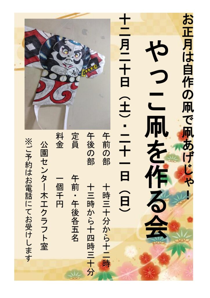 お正月には手作りのやっこ凧で遊びませんか?色を塗るところから始めます♪お申込みお待ちしております!!
