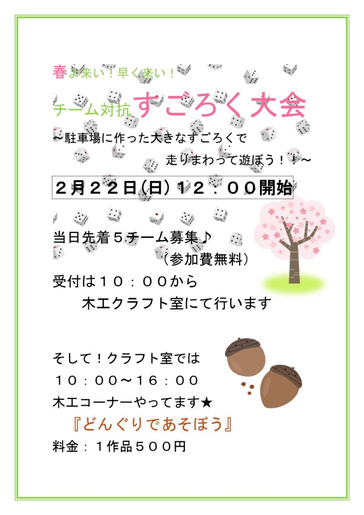2026.02.21 イベント 『大すごろく大会』のお誘い♪ 雪はない!けどお天気のいい3連休、何かみんなで遊びたい!!と思い、駐車場を使った『大すごろく大会』を企画しました!木工クラフト室前で大きな声で叫び、走り回りましょう♪