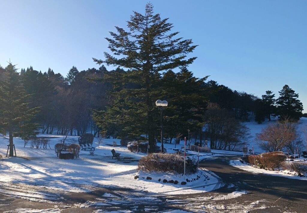 吉和インターからさらに標高が300mほど高いもみのき森林公園。インターのあたりで標高は600mほどですので、ここは900m前後です。積雪や凍結も多いです。くねくねの山道は陽のあたらない場所もあってなかなか融けません。中国道に冬タイヤ規制が出ていなくても、吉和インターをおりてからがノーマルタイヤだと困難なことがよくあります。また、お天気予報は廿日市市ではなく、広島県北部&島根&鳥取の合わせ技でご確認ください(笑)。山のお天気は変わりやすいので、道路状況と併せてお気軽にお電話でお問合せくださいね。