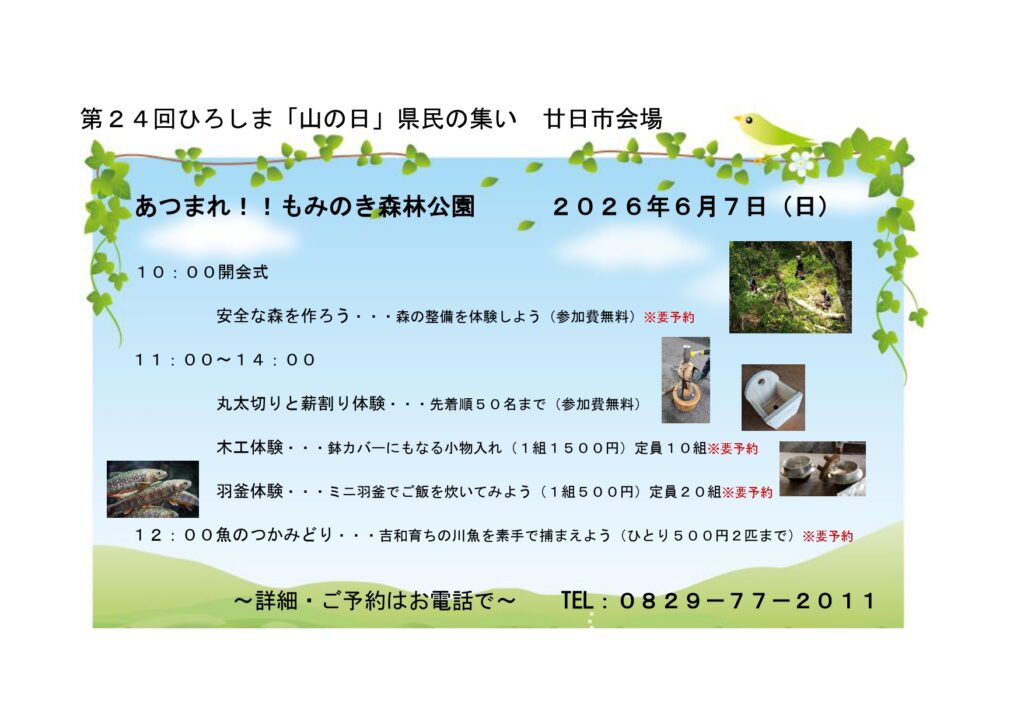 2026.04.26 お知らせ 第24回ひろしま「山の日」県民の集い 山で学び、山で遊ぼう!今年も廿日市会場としてみなさまのご参加をお待ちしております。ご予約はお電話でお受けします。『魚のつかみどり』は通常よりお得な料金です♪ぜひ林業体験とともにお楽しみください!